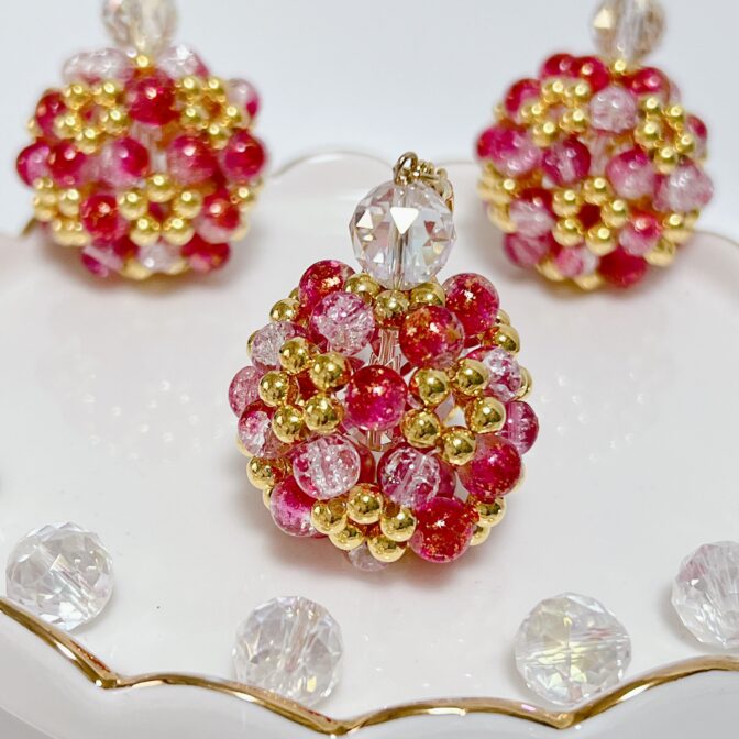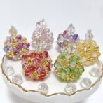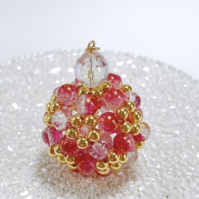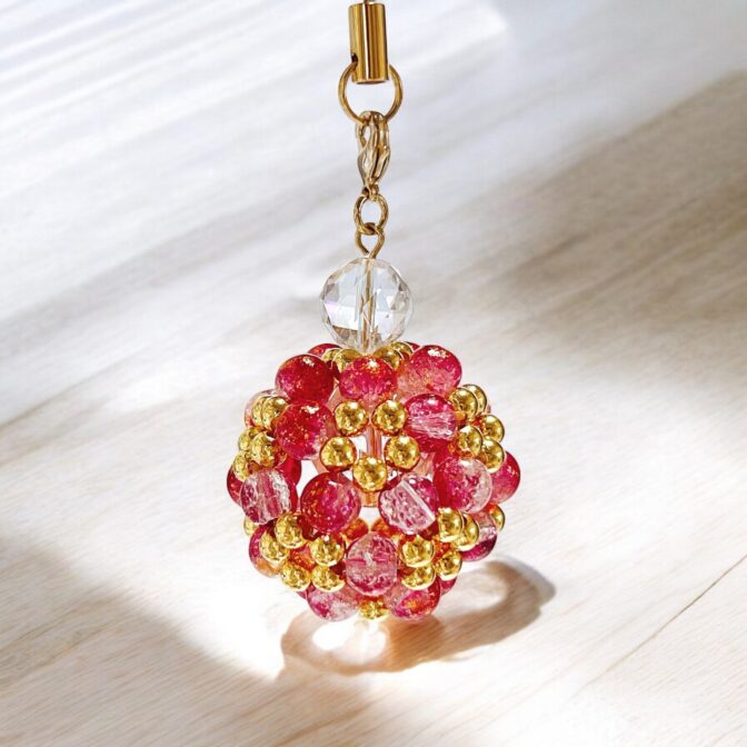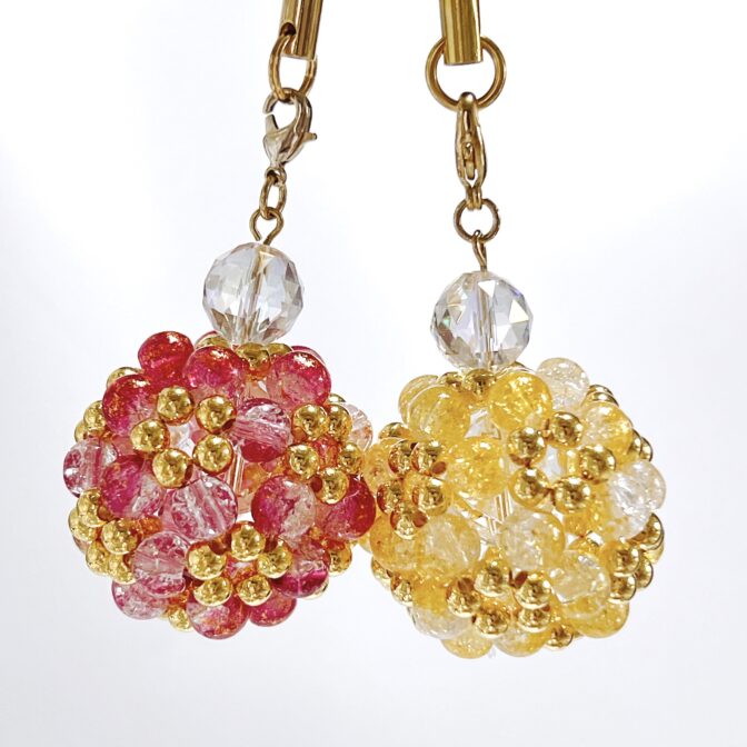 クラック加工×金箔のガラスビーズとメタルビーズを90個贅沢に使用し、繊細に編み上げたビーズボール。角度によって異なる表情を見せるグラデーションカラーが、まるで光の粒を集めたように煌めきます。