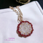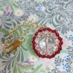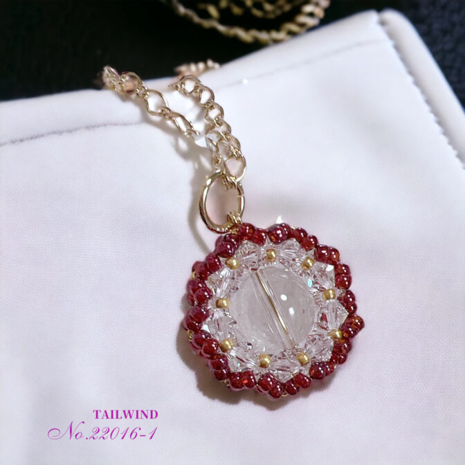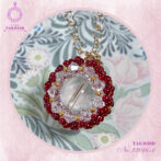 14mmの水晶の周りを4mmのクリスタルビーズと丸小ビーズで1つ1つ丁寧に囲んだ繊細なデザインです。たくさんのビーズで花びらのように編み込んだ可愛らしいデザインで、見るたびに幸せを感じる毎日持ち歩きたくなるようなチャームです。