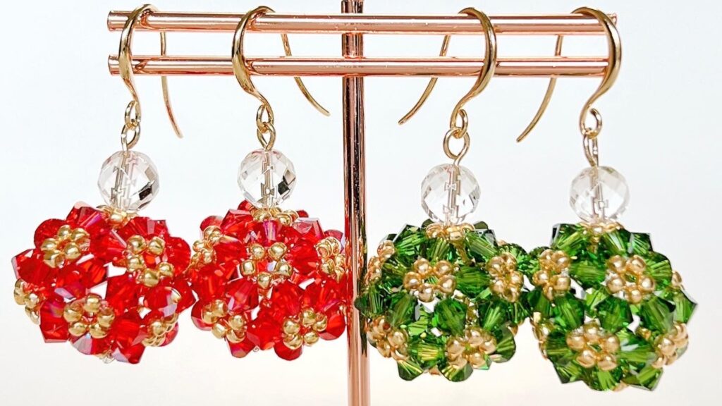 こちらのショップでは、2種類のビーズを花編みという技法でボールのように丸く編み、中心に水晶を入れたオリジナルデザイン《幸せのビーズボール》のアクセサリーを販売しています。