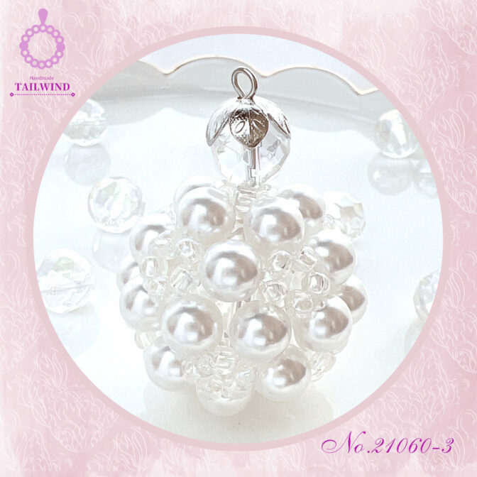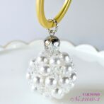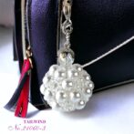 艶やかなパールビーズと虹色にきらめくシードビーズを贅沢に90粒使用し、丸く編み上げたビーズボール。その中心には、14mmのホワイトアクアオーラ水晶をそっと忍ばせています。