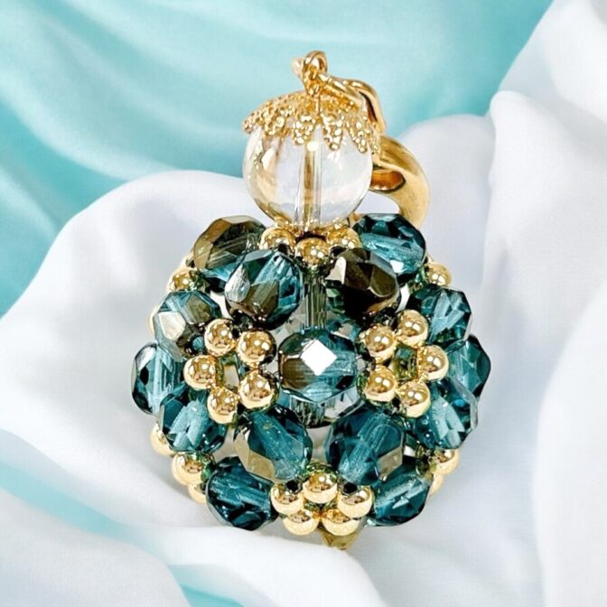 エメラルドグリーンのファイアポリッシュビーズと、やさしい光沢のパールゴールドビーズを組み合わせ、90粒を立体的に丸く編み上げました。