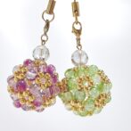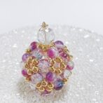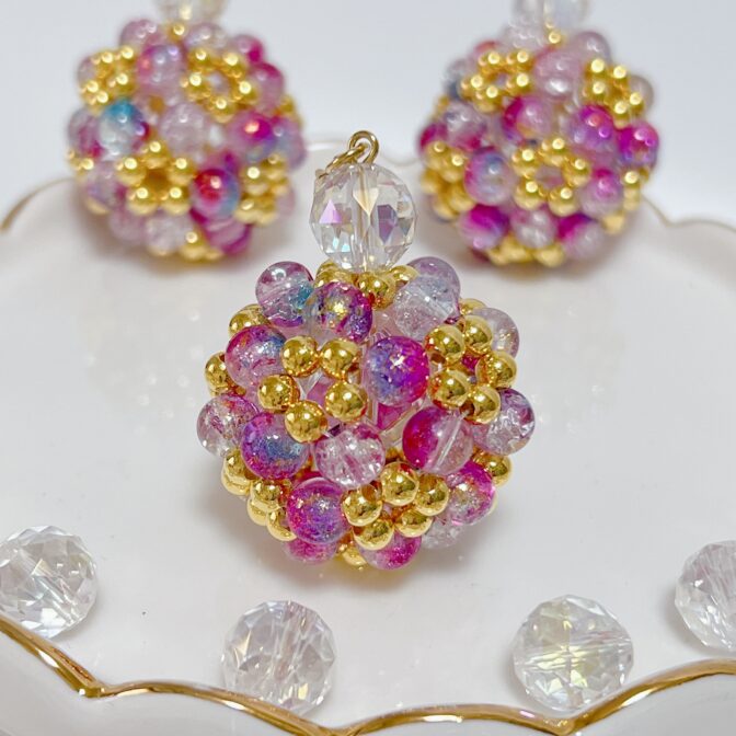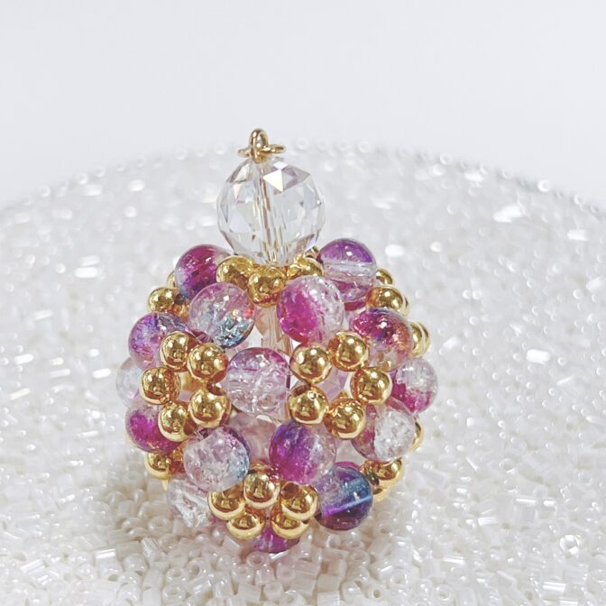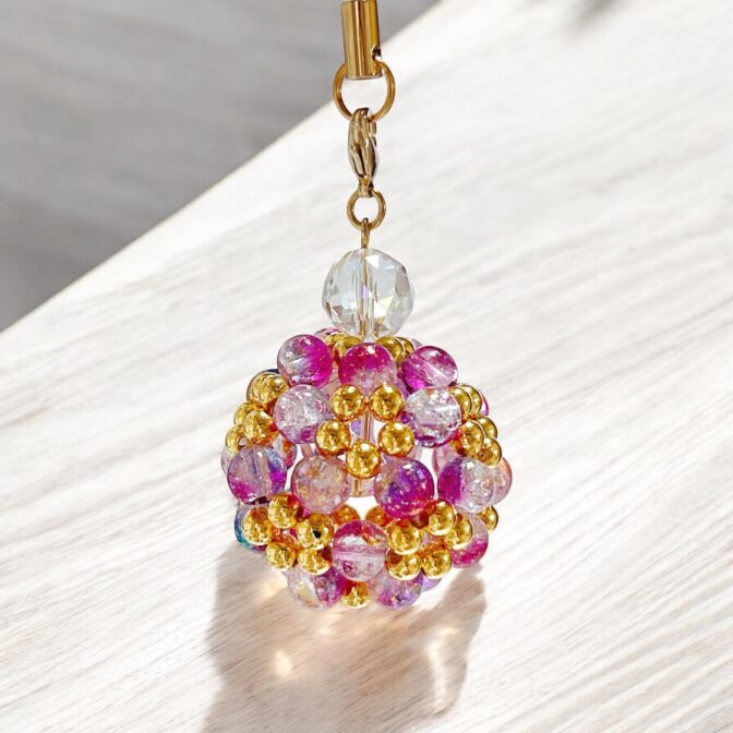 ◉ クラック加工×金箔のガラスビーズとメタルビーズを90個贅沢に使用し、繊細に編み上げたビーズボール。角度によって異なる表情を見せるグラデーションカラーが、まるで光の粒を集めたように煌めきます。
