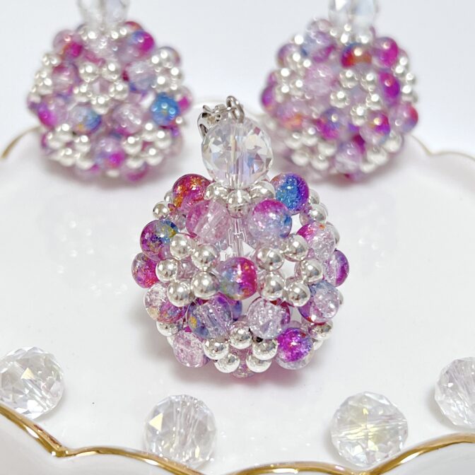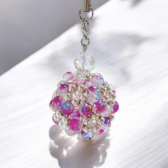 ◉ クラック加工×金箔のガラスビーズとメタルビーズを90個贅沢に使用し、繊細に編み上げたビーズボール。角度によって異なる表情を見せるグラデーションカラーが、まるで光の粒を集めたように煌めきます。
