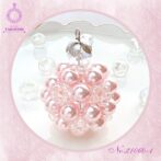 艶やかなパールビーズと虹色にきらめくシードビーズを贅沢に90粒使用し、丸く編み上げたビーズボール。その中心には、14mmのホワイトアクアオーラ水晶をそっと忍ばせています。
