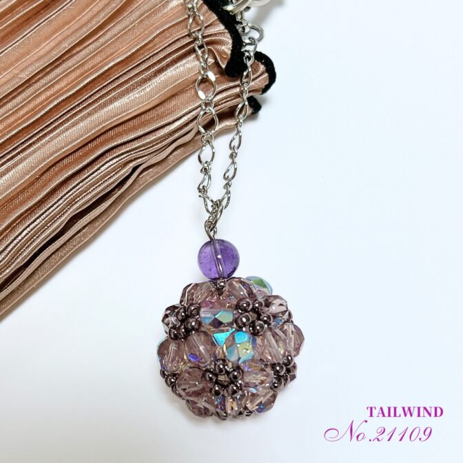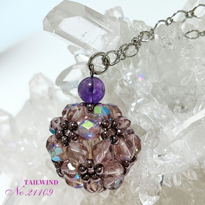 ファイアポリッシュビーズ30個・丸大ビーズ60個を花編みという技法で丸く編んだビーズボールに、天然石のアメジストを乗せたお守りになるようなアクセサリーです。