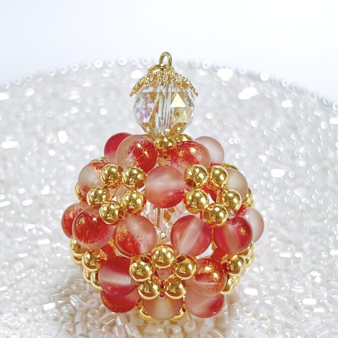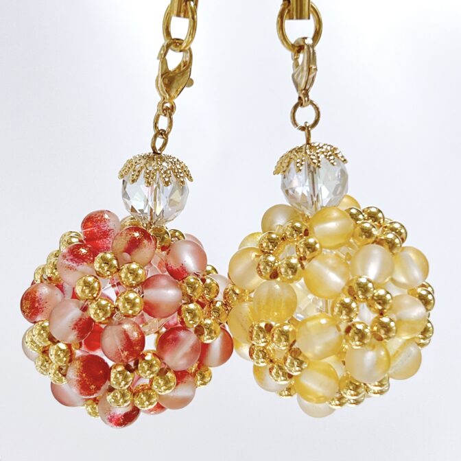 ◉フロスト加工と金箔を施したガラスビーズとメタルビーズを90個使ってボールのように丸く編み上げたビーズボールのストラップ・キーホルダーです。