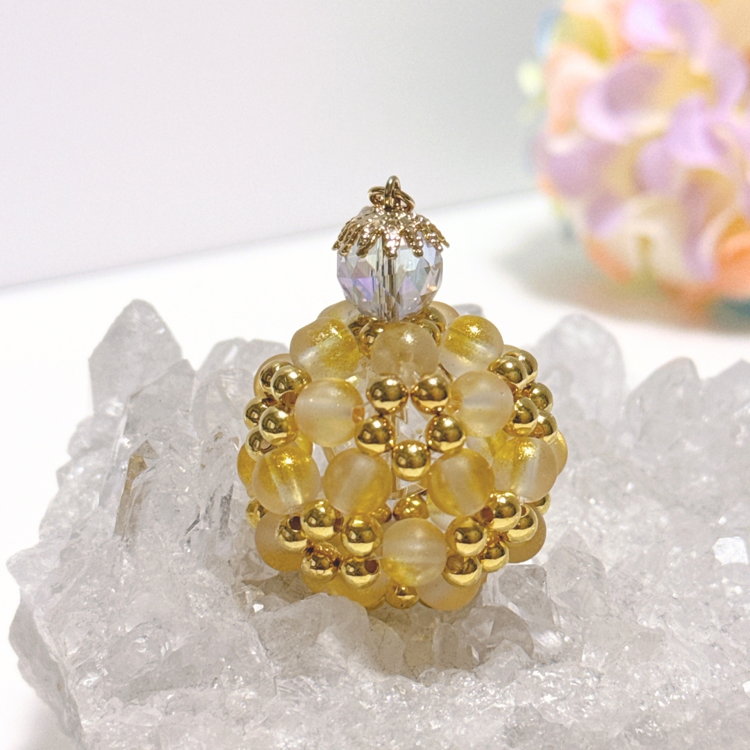 フロスト加工の箔入りグラデーションビーズとパールビーズを90粒使用し、花編みで丸く編み上げたビーズボールです。