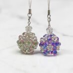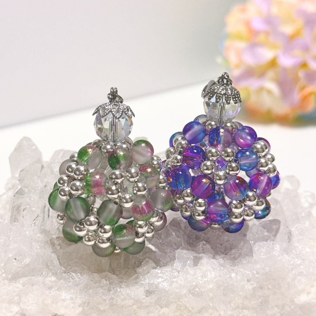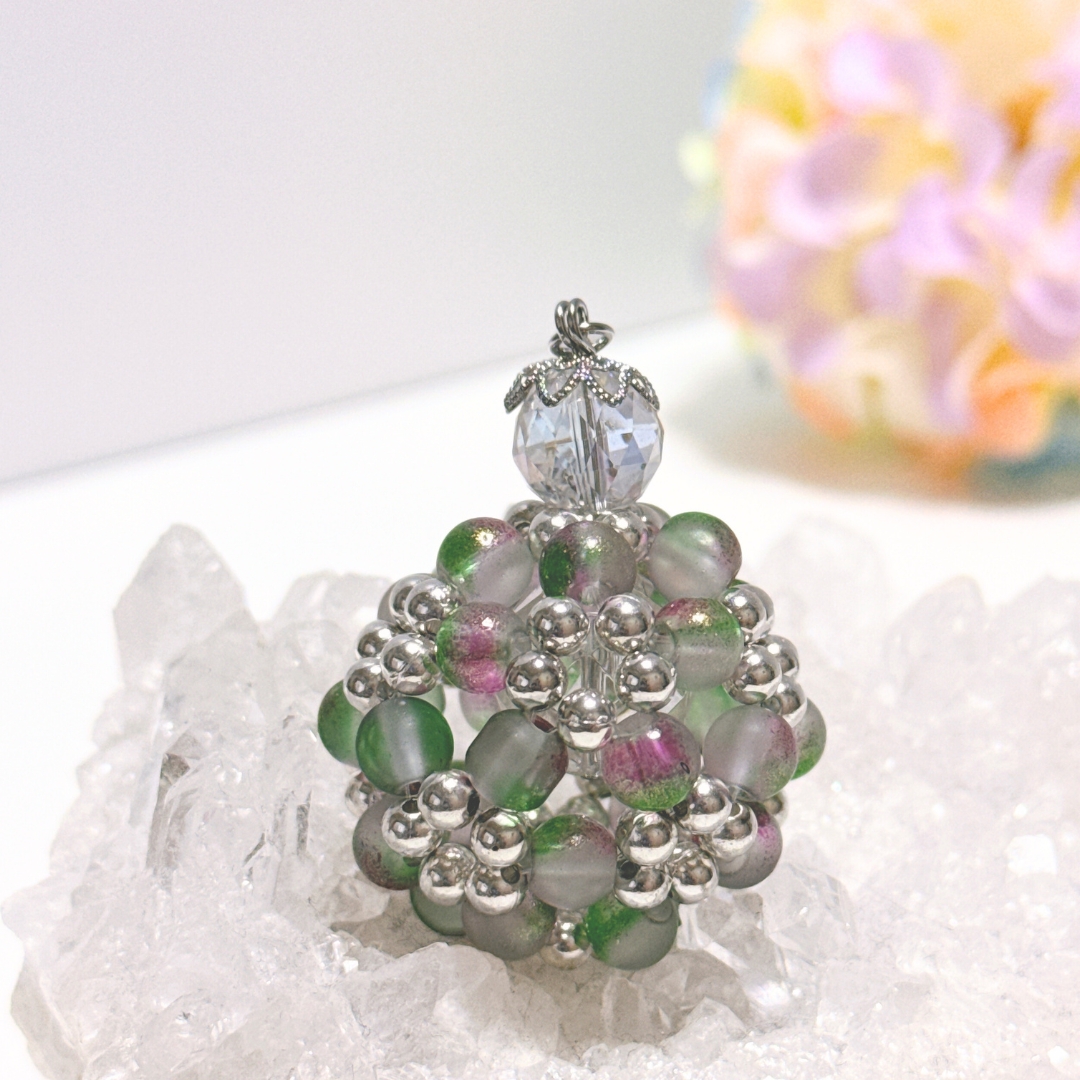 フロスト加工の箔入りグラデーションビーズとパールビーズを90粒使用し、花編みで丸く編み上げたビーズボールです。