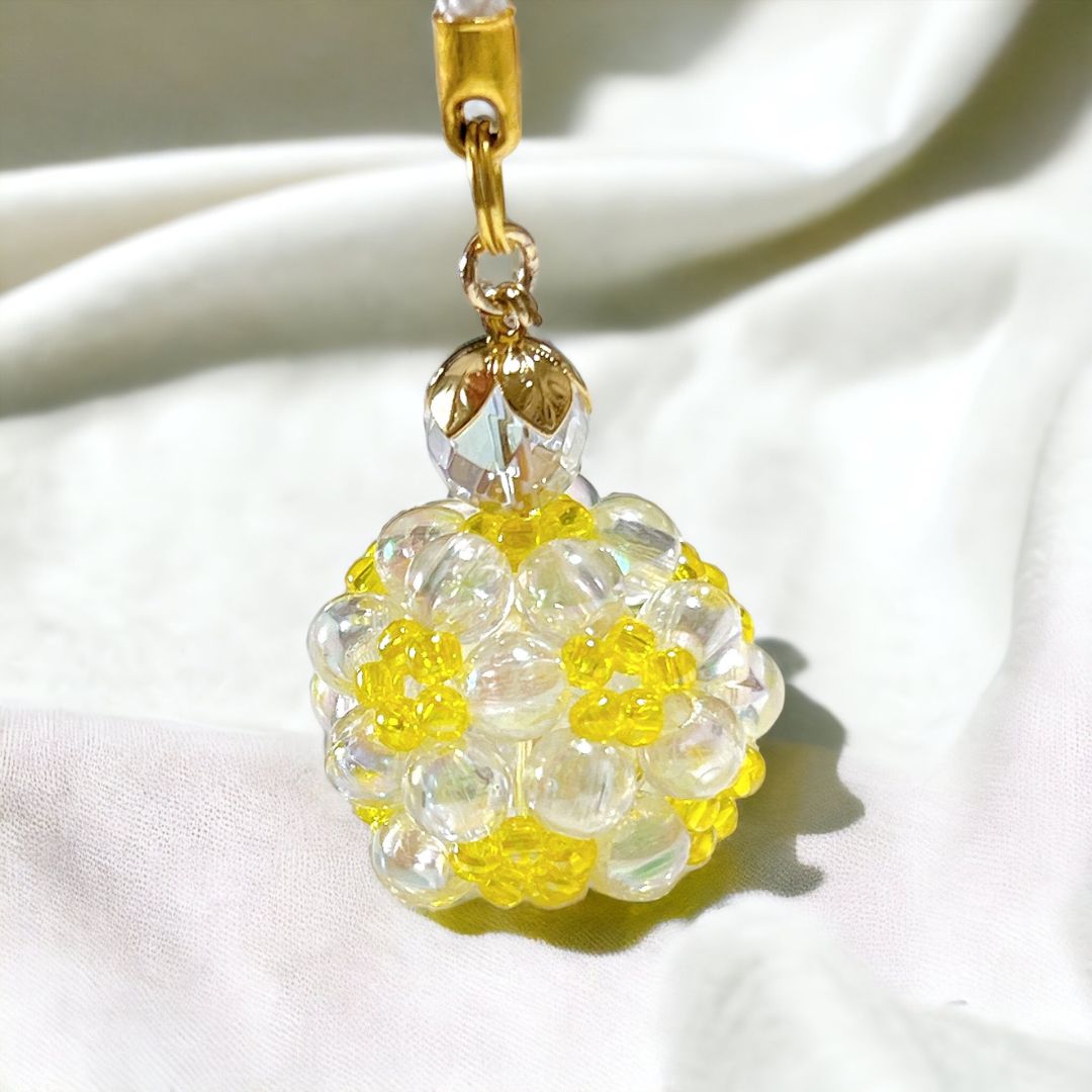 透明感あふれるオーロラビーズに、明るいイエローのビーズを組み合わせ、90粒のビーズを花編みで丁寧に丸く編み上げました。