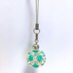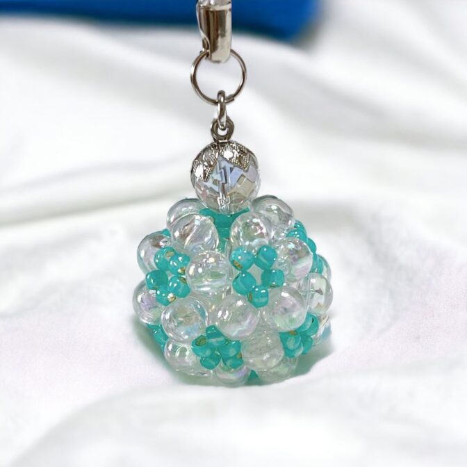 こちらは、水晶を内包したビーズボールを、キーホルダーまたはストラップとしてお使いいただけるお守りアクセサリーです。