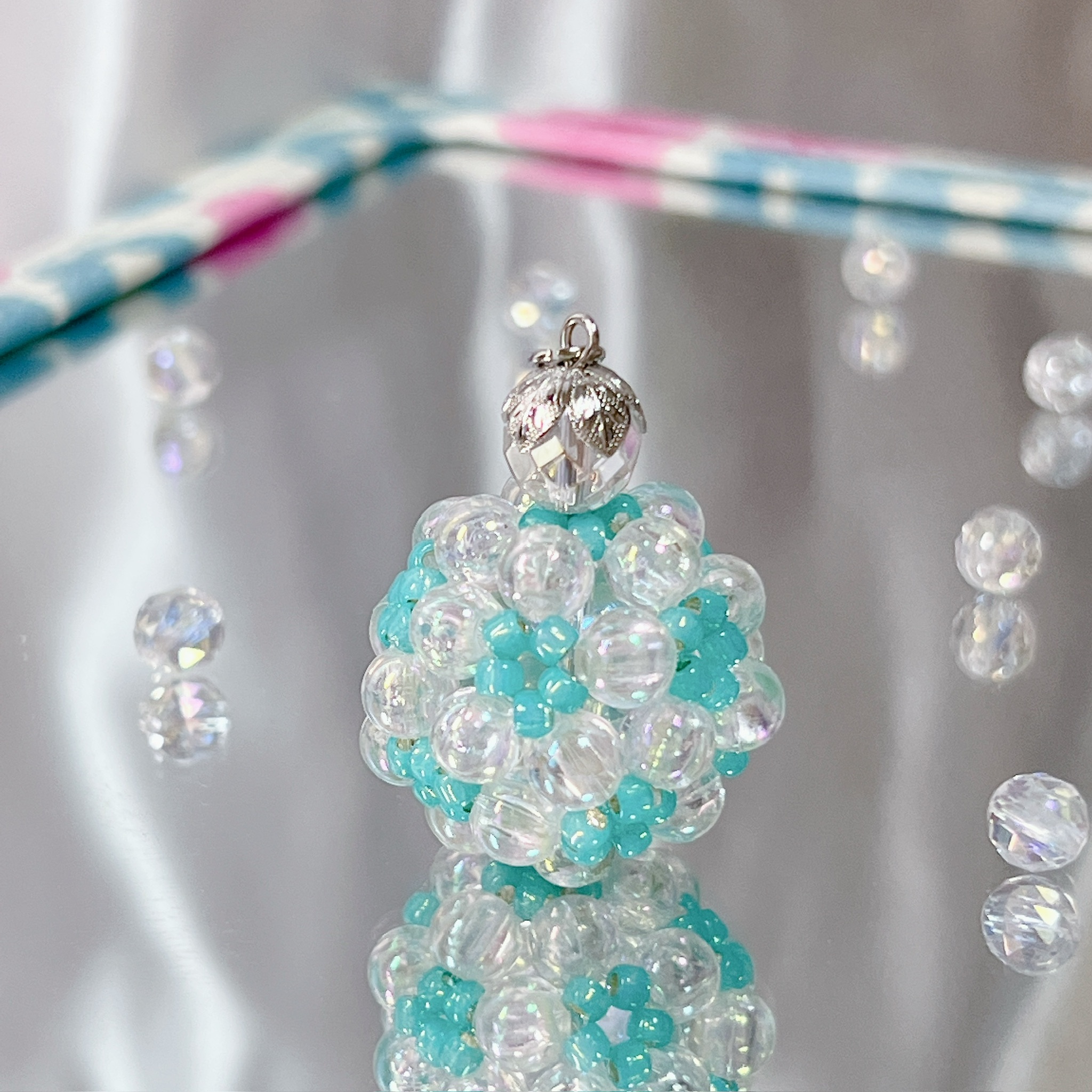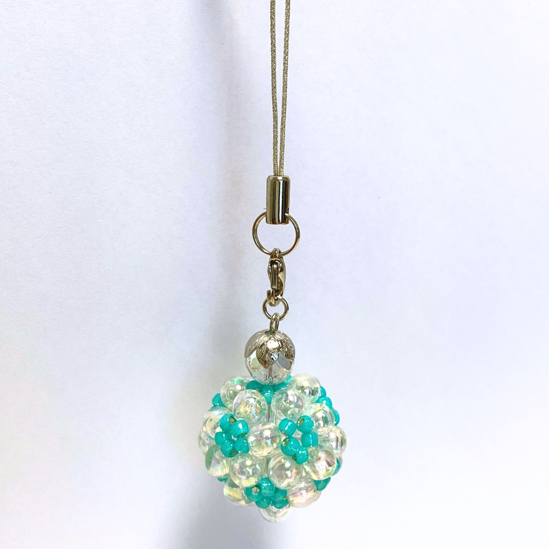 透明感あふれるオーロラビーズと爽やかな水色のビーズを組み合わせ、90粒のビーズを花編みで丁寧に丸く編み上げました。