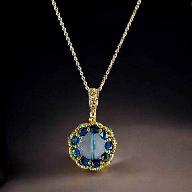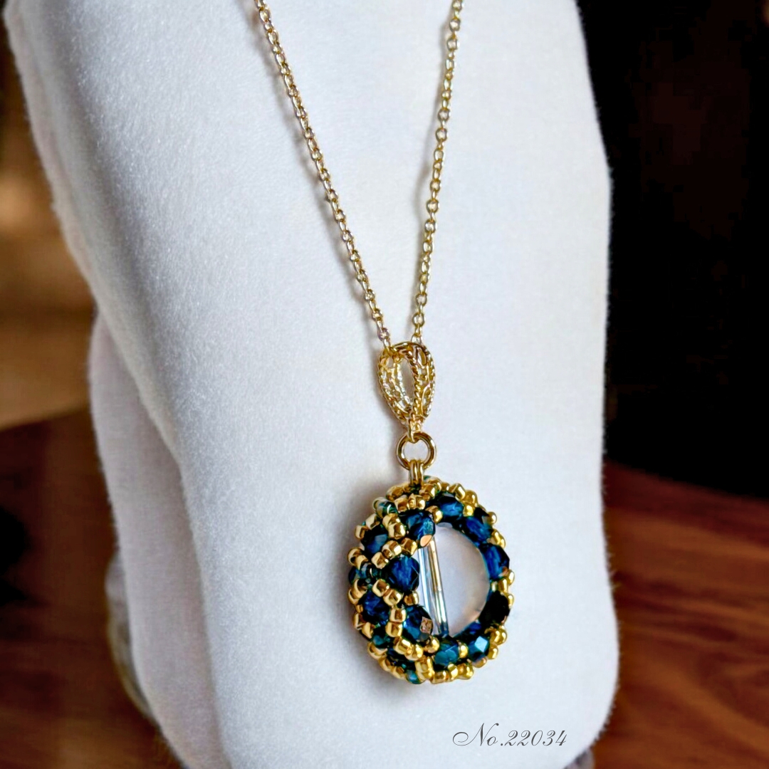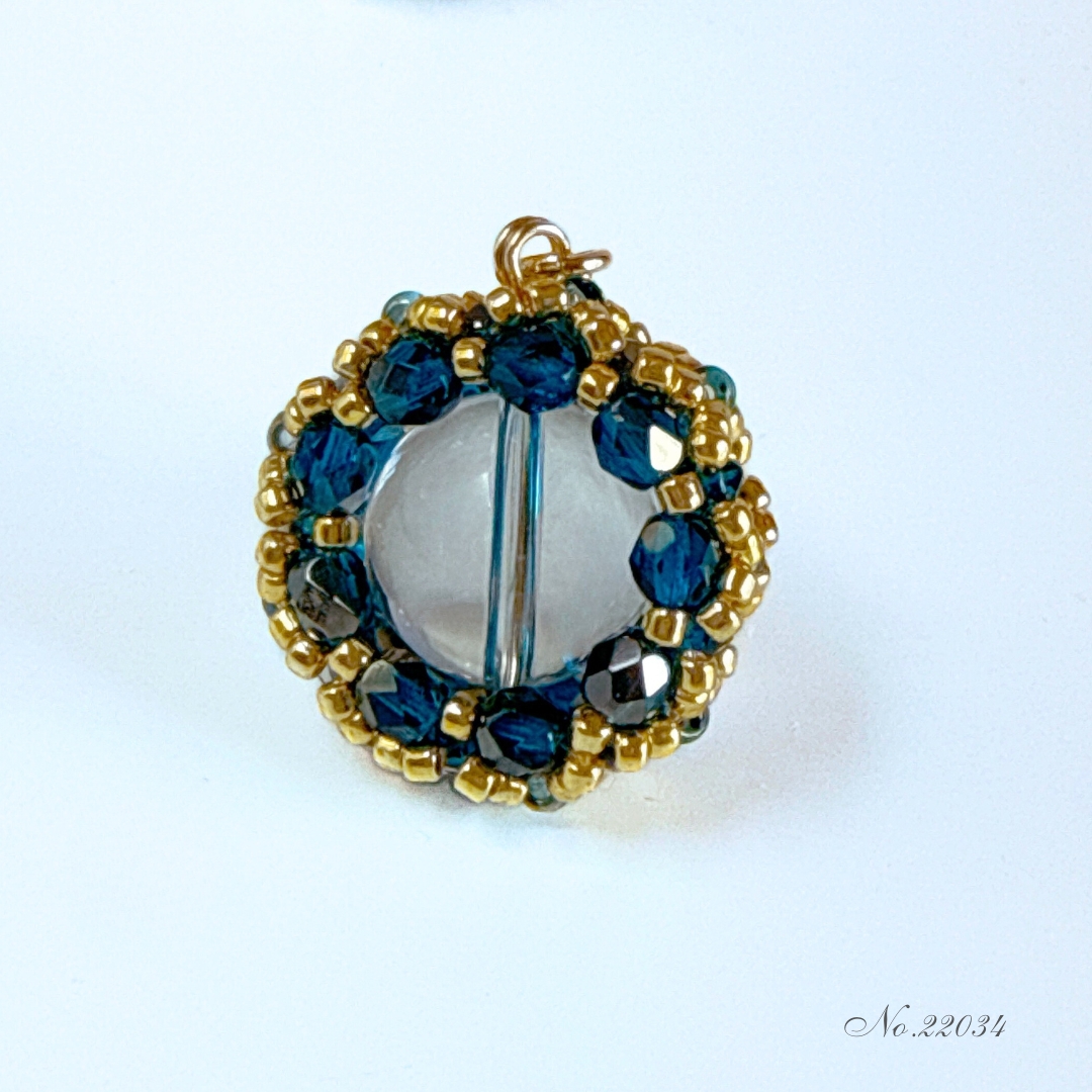 中央の透明な水晶を囲むように、深みのあるブルーのビーズが花のように広がり、光を受けるたびに落ち着きのある輝きを放ちます。